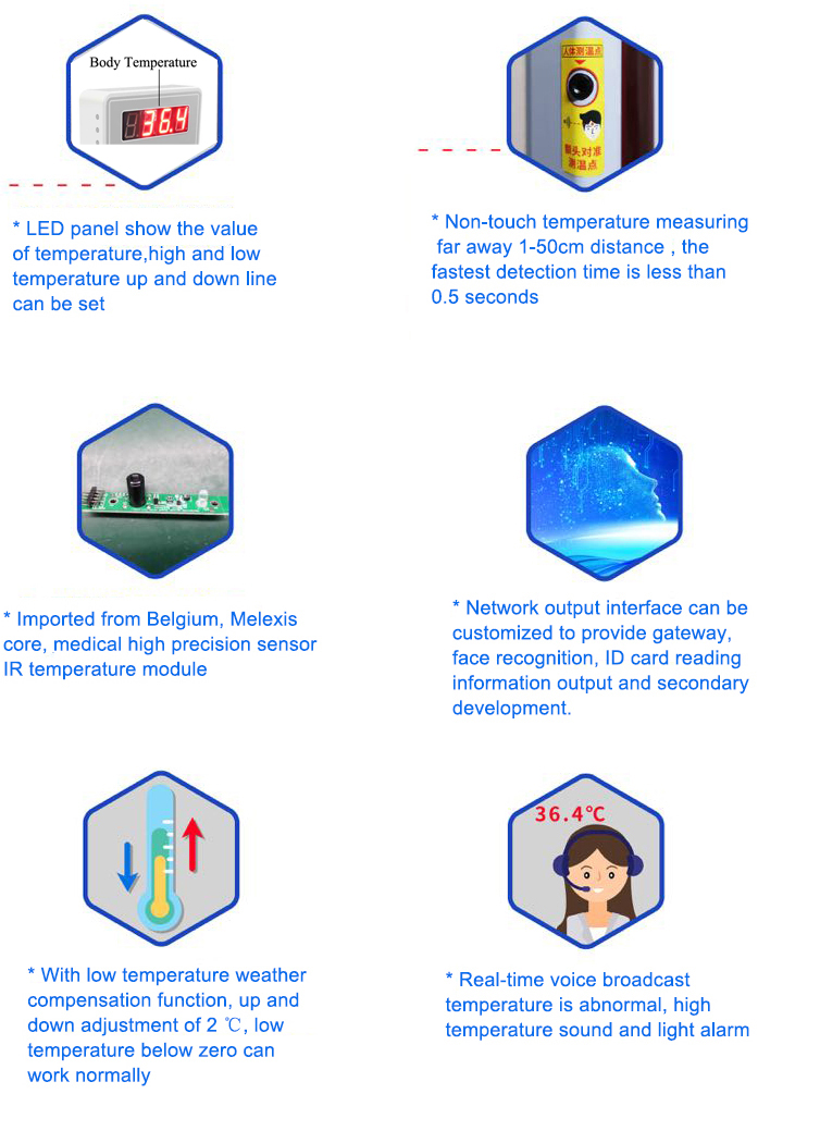 Датчик расстояния начинает работать, когда до него приближается человек или предмет. Если температура человека или обнаруженного объекта ≥ 35,5 ℃, срабатывает голос «Нормальная температура»; Если оно ниже 35,5 ℃ или выше установленного значения с сигналом тревоги, срабатывает голос «Пожалуйста, проверьте еще раз». Когда температура окружающей среды ниже 15 ℃, если температура обнаруженного человека или объекта ≥ 34,5 ℃, срабатывает голос \"Нормальная температура \"; Если оно ниже 34,5 ℃ или выше установленного значения с сигналом тревоги, срабатывает голос «Пожалуйста, проверьте еще раз».